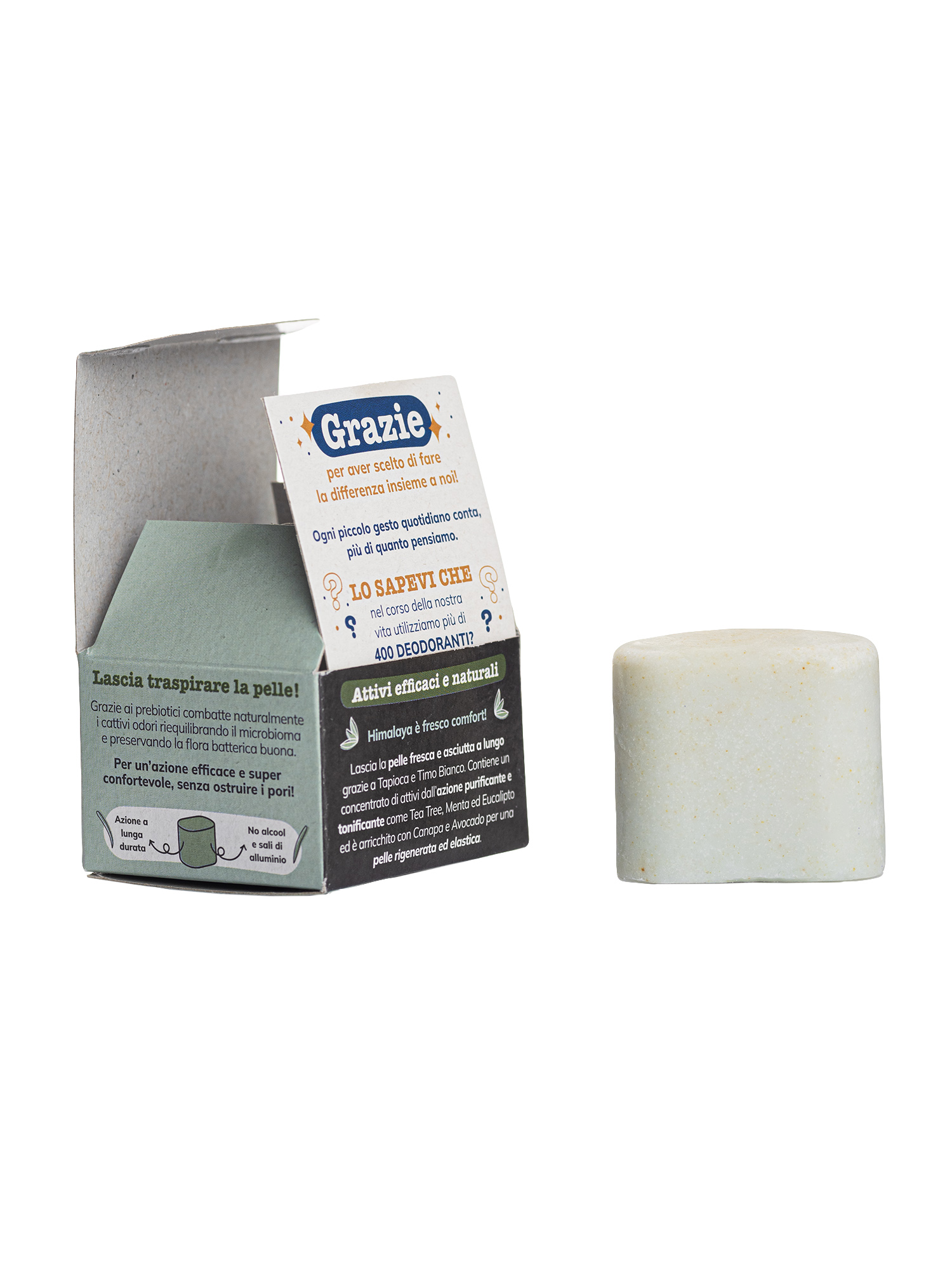 INCI: Sodium Bicarbonate, Helianthus Annuus Seed Oil*, Caprylic/Capric Triglyceride, C10-18 Triglycerides, Hydrogenated Castor Oil, Zinc Ricinoleate, Butyrospermum Parkii Butter*, Triethyl Citrate, Coco-Caprylate/Caprate, Tapioca Starch*, Prunus Amygdalus Dulcis Oil*, Cannabis Sativa Seed Oil*, Mentha Piperita Oil*, Citrus Aurantifolia Peel Oil Distilled, Inulin, Jojoba Esters, Thymus Vulgaris Leaf Oil, Persea Gratissima Oil, Tocopherol, Citrus Limon Peel Oil*, Eucalyptus Globulus Leaf Oil, Bisabolol*, Zingiber Officinale Root Oil, Fructose, Melaleuca Alternifolia Leaf Oil*, Glycine Soja Oil Unsaponifiables, Helianthus Annuus Seed Oil Unsaponifiables, Aqua, CI 77007, Linalool, Citral, Limonene (*da agricoltura biologica)