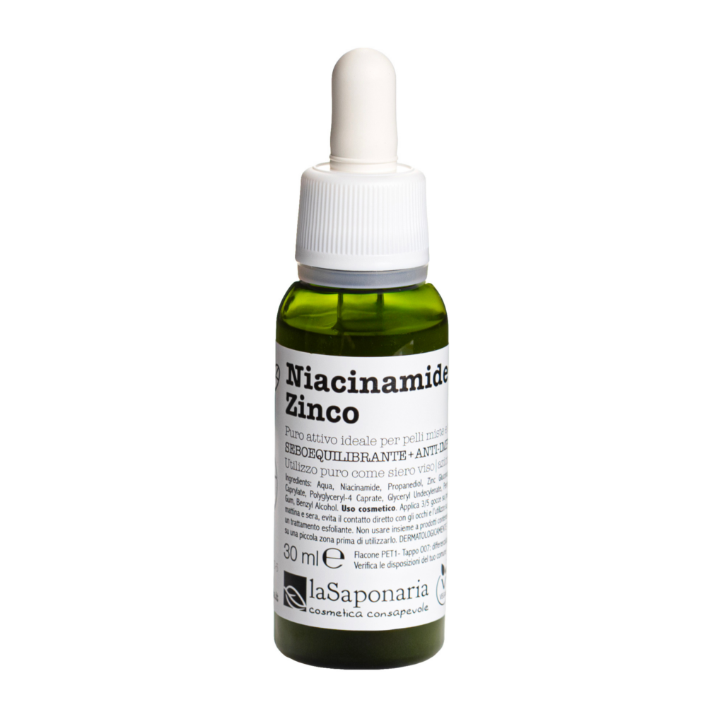INCI: Aqua, Niacinamide, Propanediol, Zinc Gluconate, Glycerin, Urtica Dioica Leaf Water*, Xanthan Gum, Polyglyceryl-4 Caprate, Glyceryl Caprylate, Glyceryl Undecylenate, Pentylene Glycol, Benzyl Alcohol (*da agricoltura biologica).
